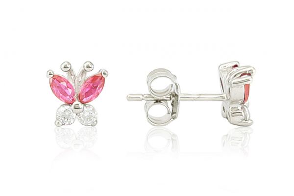 Ezüst gyermek fülbevaló bedugós ródiumbevonatos pillangó élénk rózsaszín és fehér kövekkel