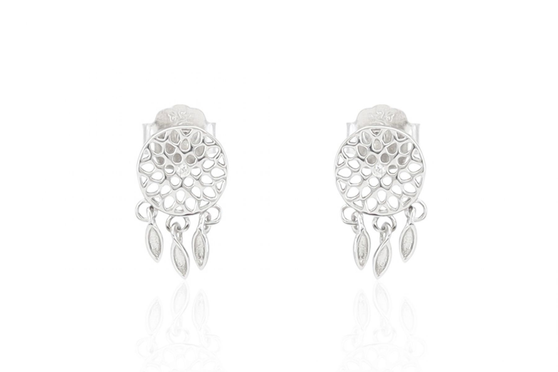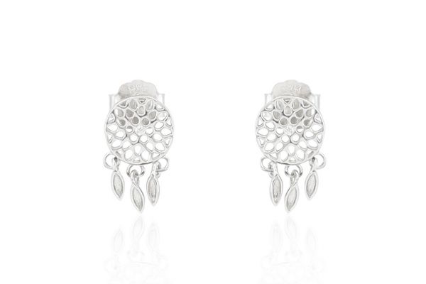 Ez a gyönyörű ezüst fülbevaló egyszerre jelképez mandalát és álomfogót. A leginkább virágmotívumhoz hasonló mandala a belső utat és elmélyedést szimbolizálja. A szimmetrikus, áttört minta ugyanakkor álomfogóra emlékeztet, mely megfogja a rémálmokat, és csak a jókat engedi át, melyek a tollak segítségségével eljutnak a medál viselőjéhez. Az apró fehér cirkónia kövek még varázslatosabbá teszik ezt a szép fülbevalót.