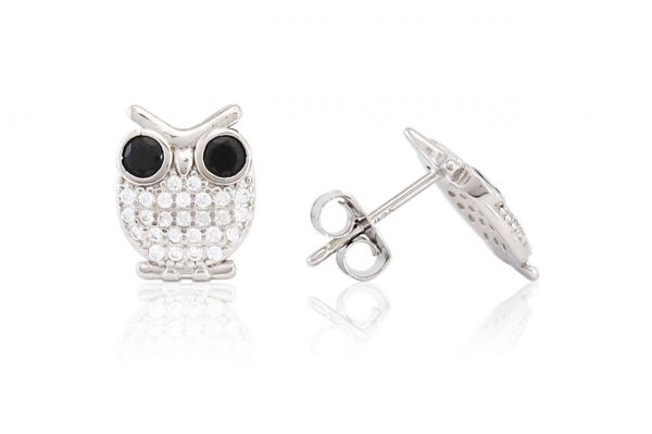 Ezüst fülbevaló bedugós bagoly köves díszítéssel ródiumbevonatos