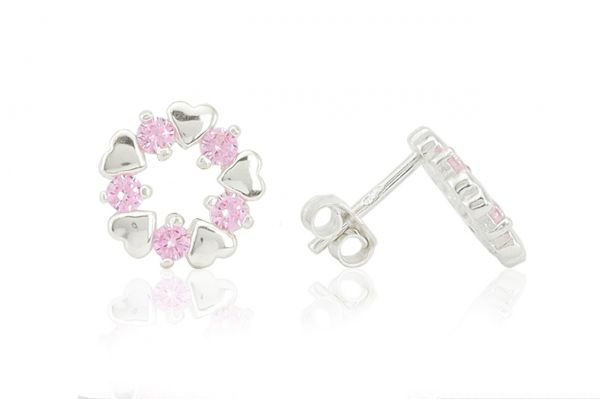 Ezüst fülbevaló bedugós szíves rózsaszín köves koszorú