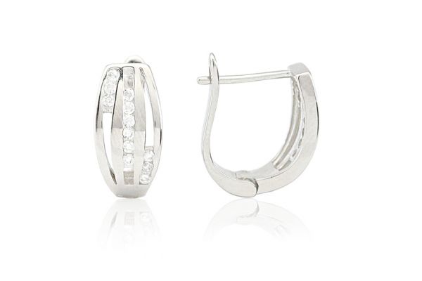 Ezüst fülbevaló franciakapcsos modern íves köves ródiumbevonatos Anyaga: 925 ezüst Bevonat: ródiumbevonatos Méret: 6 x 16 mm ; belső hasznos terület: 11 x 10 mm Szélesség: 6mm Kapocs: franciazáras Kő: fehér apró cirkónia Súly: 3.35 g