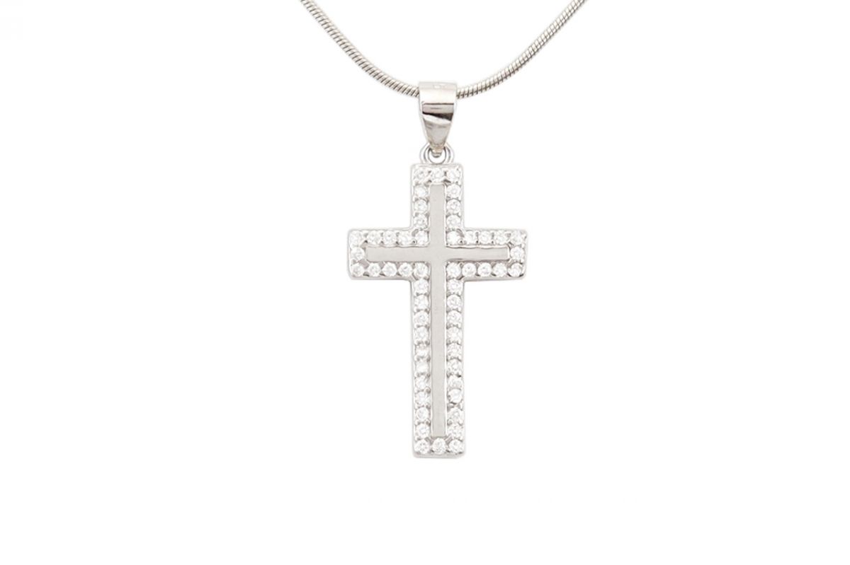 Ezüst medál körben apró kövekkel díszített kereszt ródiumbevonatos